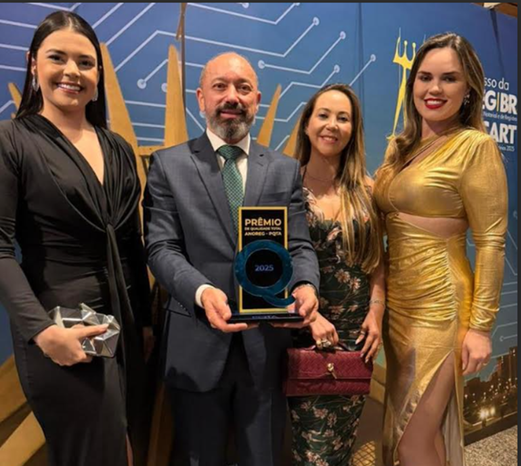 NOITE DE RECONHECIMENTO NACIONAL – Na quinta-feira, 27 de novembro, o conselheiro da Arpen-GO, vice-presidente da Arpen Brasil e tabelião do cartório homônimo, em Aparecida de Goiânia, Bruno Quintiliano, participou da 21ª edição do Prêmio de Qualidade Total ANOREG (PQTA) 2025, ocorrida no Hotel Royal Tulip Brasília Alvorada. Na ocasião, o Cartório Bruno Quintiliano recebeu três certificações nacionais: Selo Diamante, Rubi Evolução e Rubi Master. O evento, neste ano registrou recorde de 294 cartórios inscritos, reconheceu 272 serviços notariais e de registro que alcançaram os mais altos padrões de excelência no País, reforçando o destaque e o compromisso do cartório goiano com qualidade, inovação e atendimento de referência